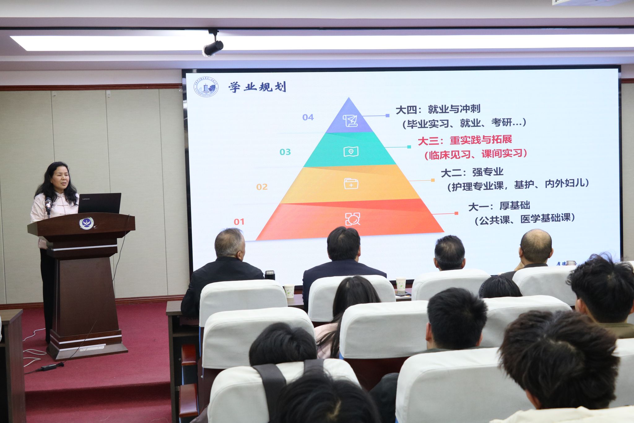 报告会上,刘艳萍结合自身成长经历与见闻,着重强调科学的职业规划是护理学子锚定方向、行稳致远的核心支撑,需遵循“评估自身、设定目标、落实行动、持续学习”的逻辑脉络,鼓励同学们主动发掘潜力、坚持终身成长,以定力规避“拖延症”“三分钟热度”等问题,在不懈奋斗中实现人生价值。