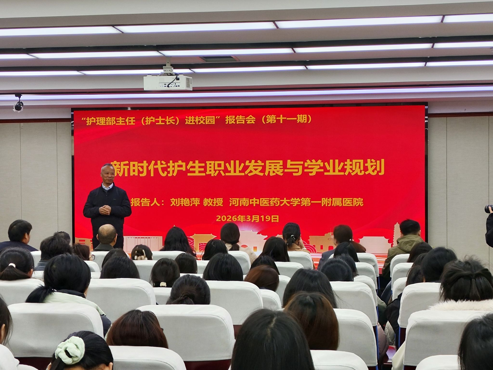 为强化护生专业引领和理想信念教育,3月19日下午,我院“护理部主任(护士长)进校园”第十一期报告会暨新时代护生职业发展与学业规划报告会在学院二楼报告厅举行,本次报告会特邀河南中医药大学第一附属医院心脏中心资深护士长刘艳萍教授作专题分享。我院全体领导班子成员、辅导员、2023级全体本科生,研究生代表、其他年级本科生代表参加学习。报告会由院党委书记谢纳泽主持。