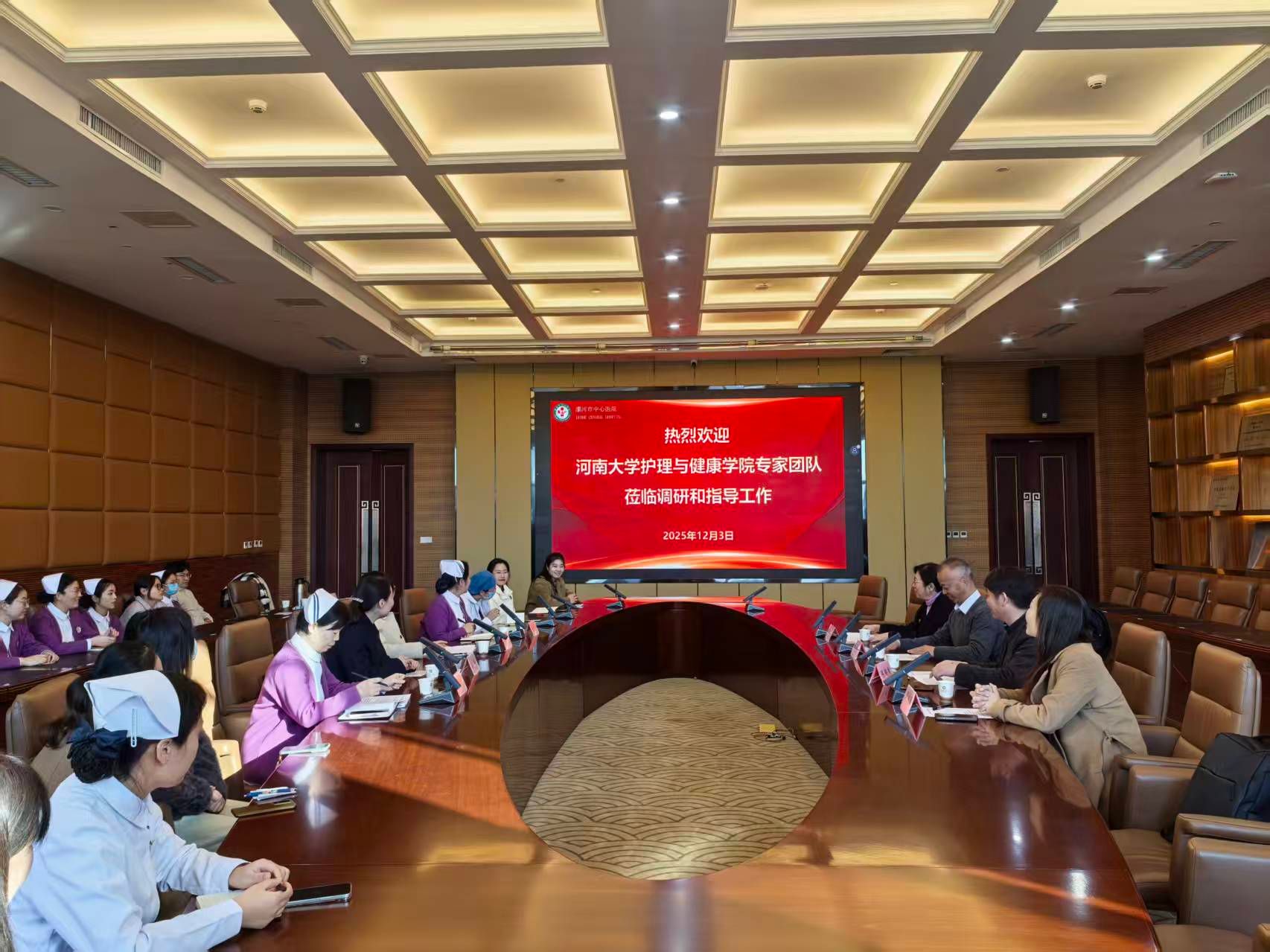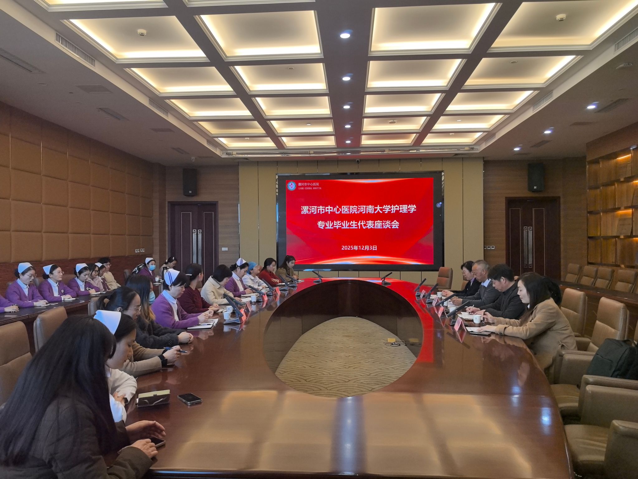 为推动毕业生高质量就业,12月3日,我院党委书记谢纳泽、副院长陈超然等一行4人,到漯河市中心医院访企拓岗并看望毕业生。在医院会议中心文博厅,谢纳泽一行与漯河市中心医院党委副书记王瑾、护理部主任侯新凤、科研办公室主任魏俊涛,以及护理部全体老师、我校护理学专业毕业生代表、该院2025级护理学专业在职人员课程研究班学员进行座谈交流。