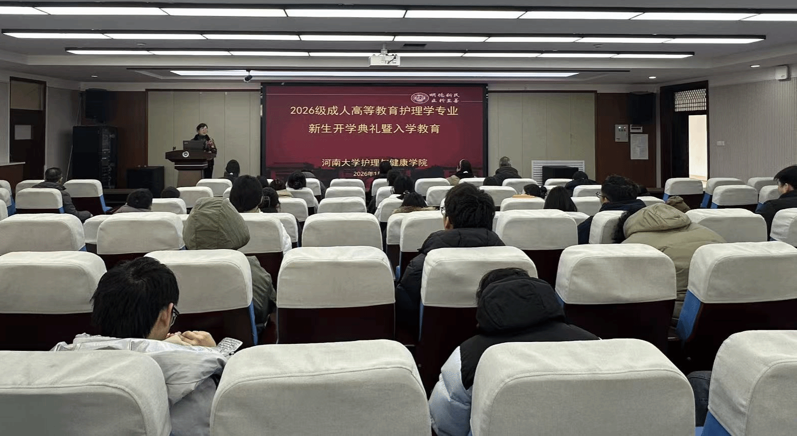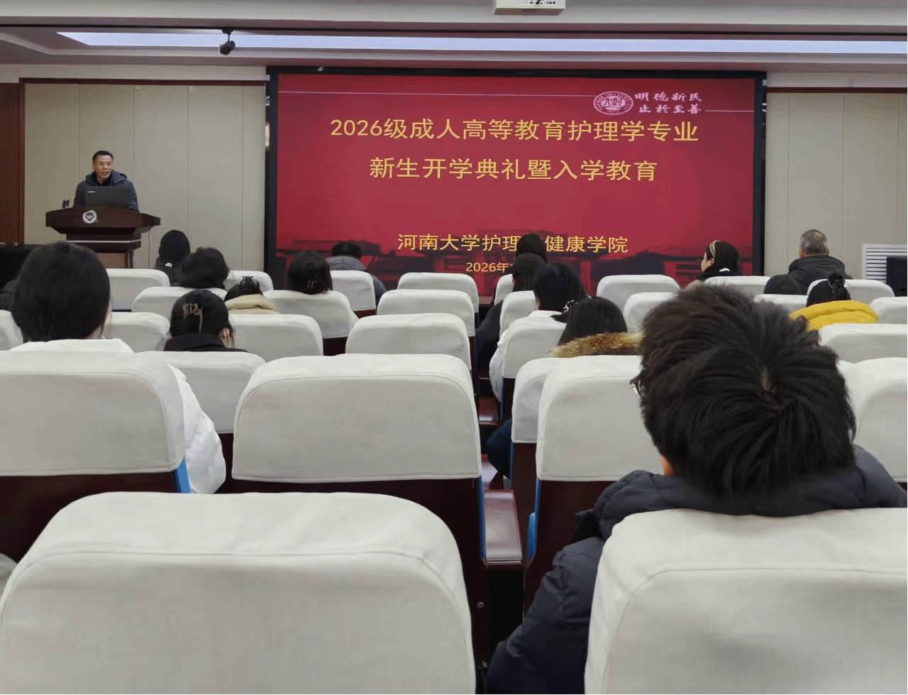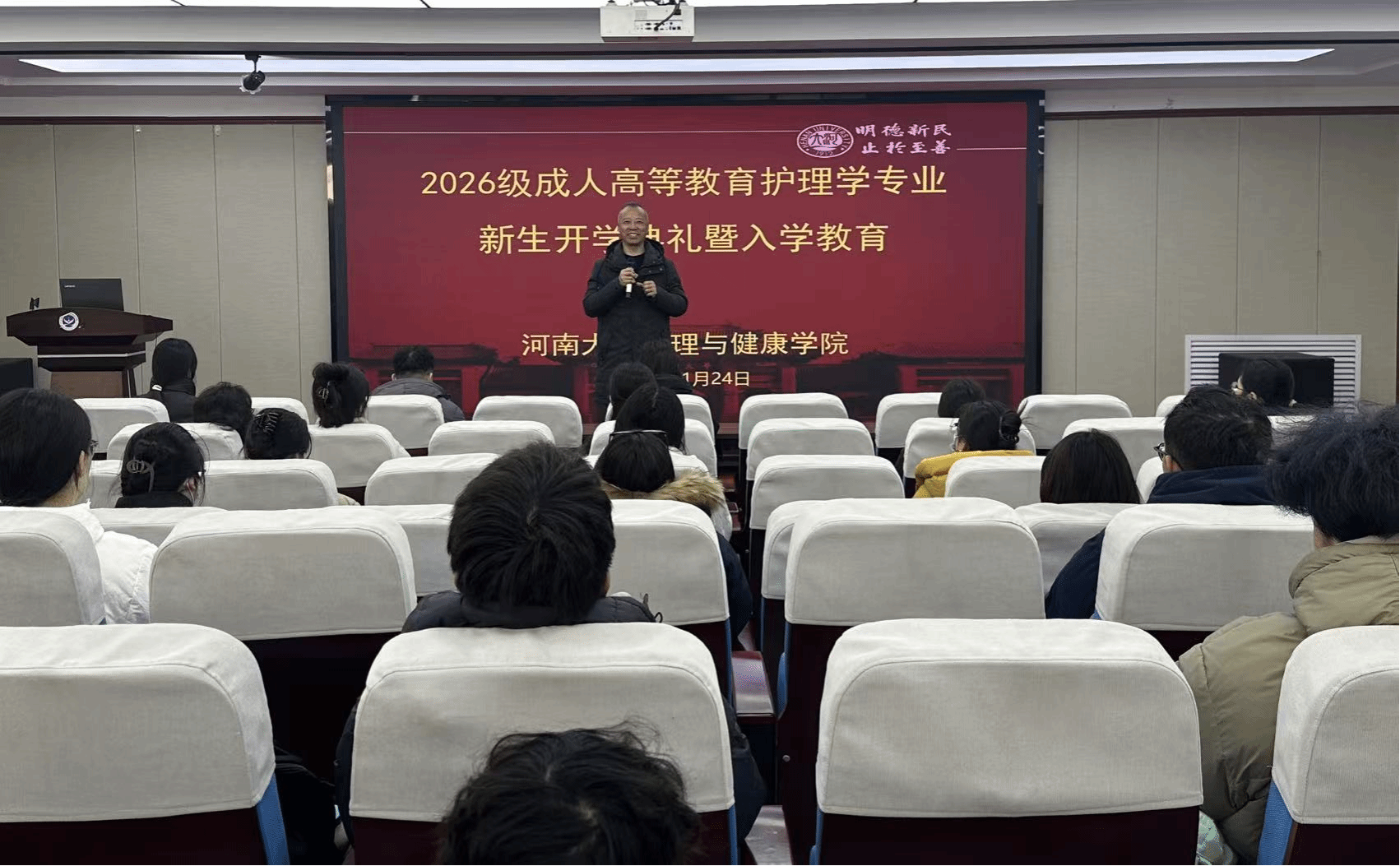 1月24日上午,我院2026级成人高等教育新生在学院一楼103工会活动室完成报到手续,并在学院二楼报告厅开展新生入学教育培训活动。院党委书记谢纳泽、副院长杜保明、继续教育办公室主任梁红霞及2026级全体新生参加。入学教育培训由杜保明主持。