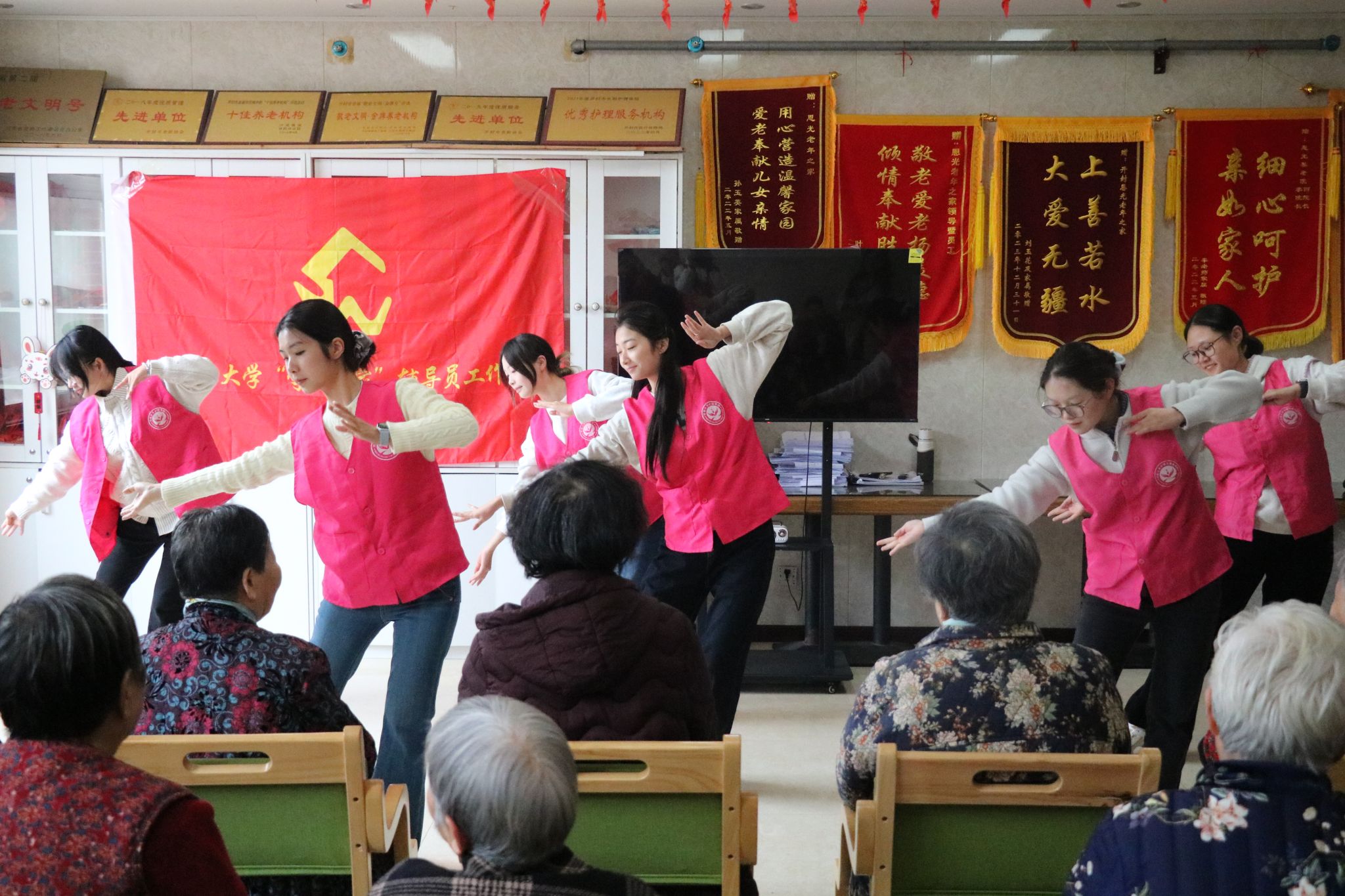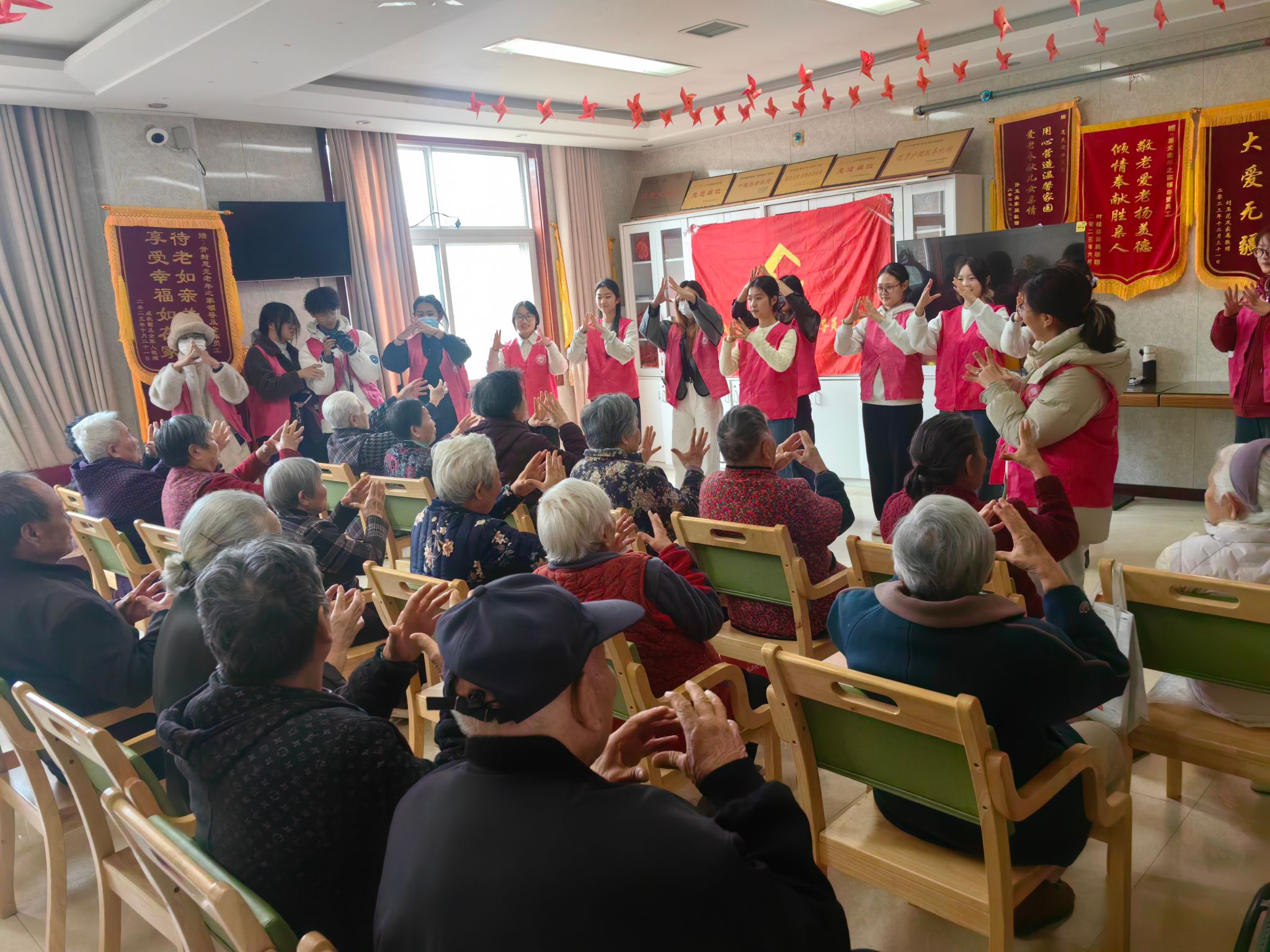 接着,师生志愿者精心准备的文艺表演与健康互动小游戏轮番登场。“红石榴”舞蹈队成员、2023级本科生安贝希等人带来古典舞《繁花》,舞步流转中满含灵动韵律,将中华传统文化里的雅致意境与东方美学韵味具象呈现。2023级本科生王念念带来戏曲表演《花木兰》,高亢嘹亮、响遏行云的腔调直击人心,引得满堂喝彩。在手指操与清肺操教学环节,志愿者耐心示范、细致指导,老人们认真跟练、积极互动,让大家掌握了实用的日常健康养护技能。活动尾声,师生走到老人们身边唠家常,现场暖意融融。临别时,老人们纷纷出门相送,不舍的眼神与叮嘱间满是温情。