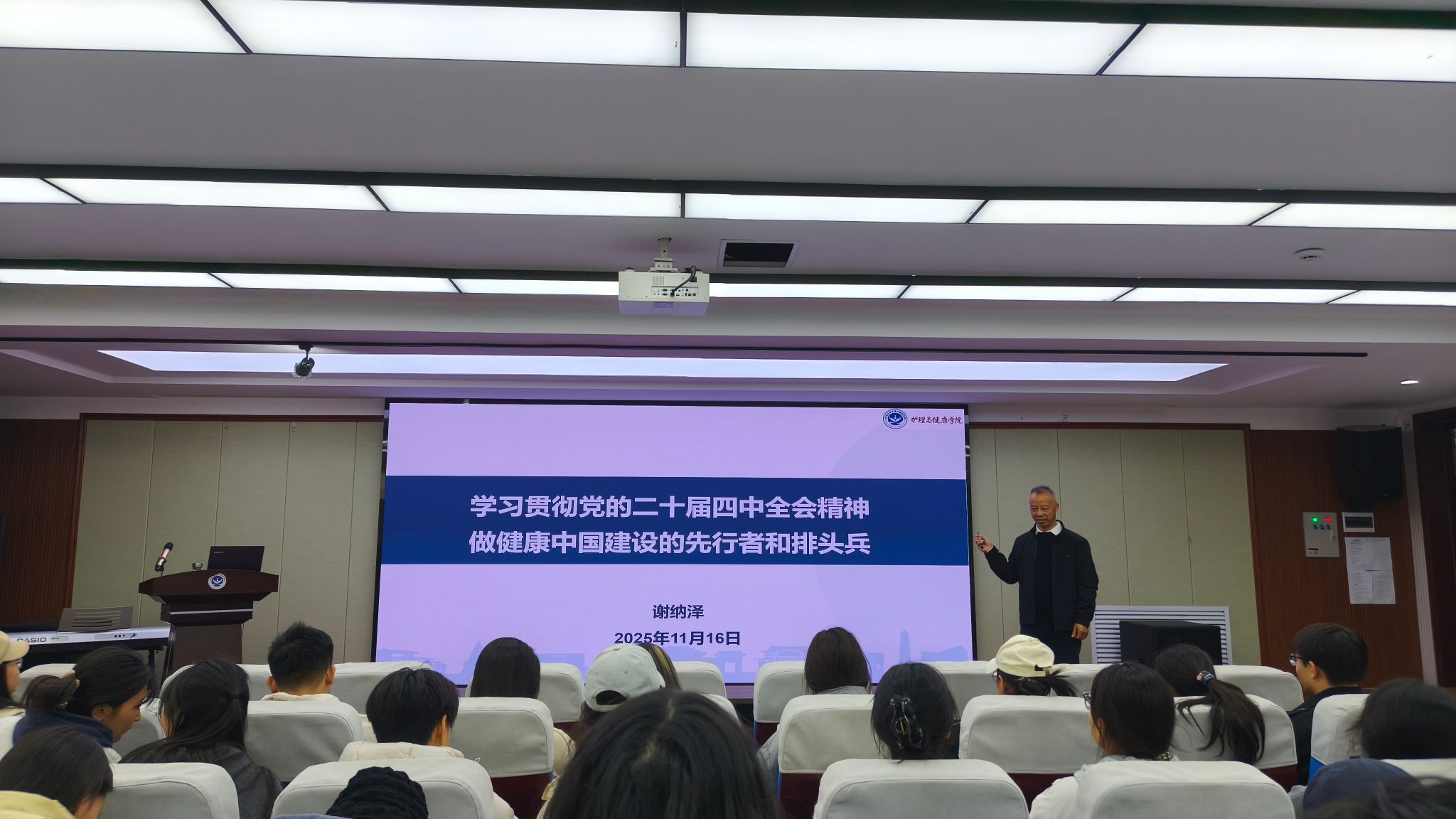 11月16日,我院在院二楼报告厅举行党的二十届四中全会精神学习宣讲会。院党委书记谢纳泽以“学习贯彻党的二十届四中全会精神,做健康中国建设的先行者和排头兵”为题,给学院团委、学生会、各年级、班级主要团学干部和学生代表做学习分享,引领青年学子深刻领会全会精神,明确时代使命与奋进方向。