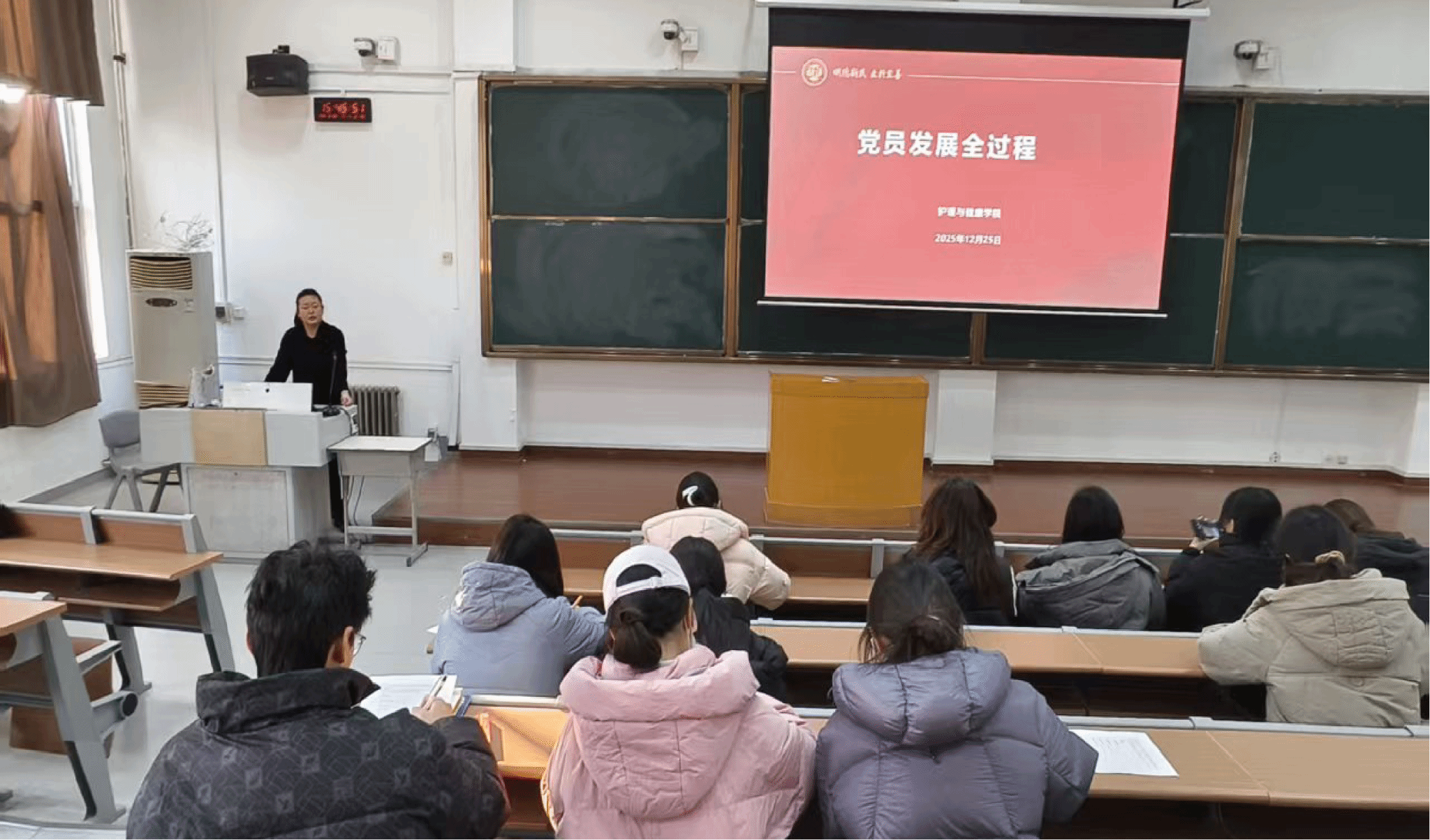 此外,结合护理专业特色,任希彤同志还对积极分子提出明确要求,希望大家在钻研专业知识、践行护理使命的过程中锤炼党性,始终以党员标准严格要求自己。她强调,党员发展各环节环环相扣、规范严谨,既是党组织选拔优秀人才的重要过程,也是个人成长进步的宝贵历练。整场党课内容详实、脉络清晰,让积极分子对党员发展全流程有了全面系统的认识,进一步激发了大家向党组织靠拢的热情。参训积极分子纷纷表示,将把此次学习成果转化为实际行动,在学习和实践中锤炼品格、增长才干,以坚定的信念和务实的作风接受党组织的考验。