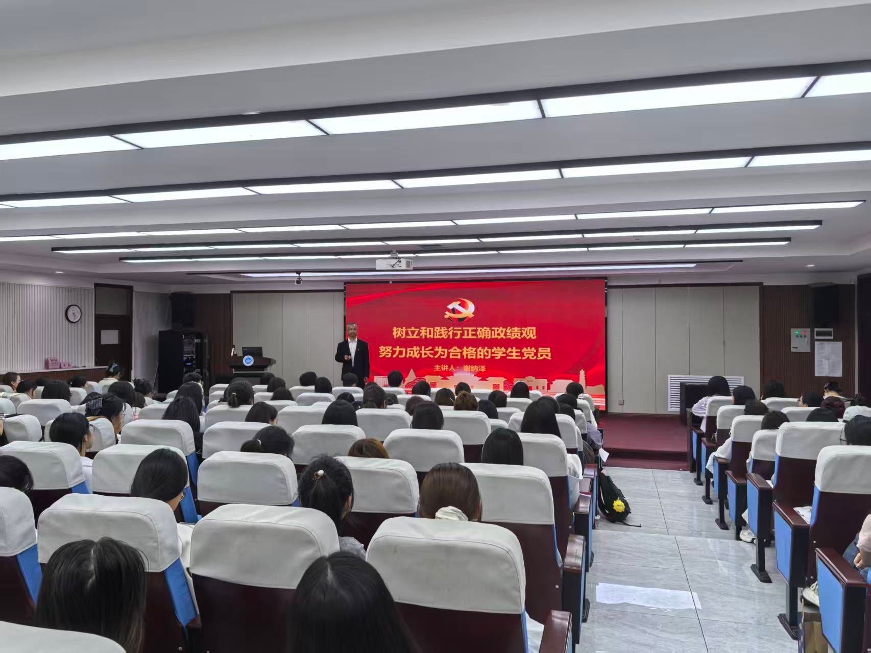 党课围绕“树立什么样的政绩观”“政绩观错位的表现”“践行正确政绩观的实践要求”“努力成长为合格的学生党员”四个维度展开。