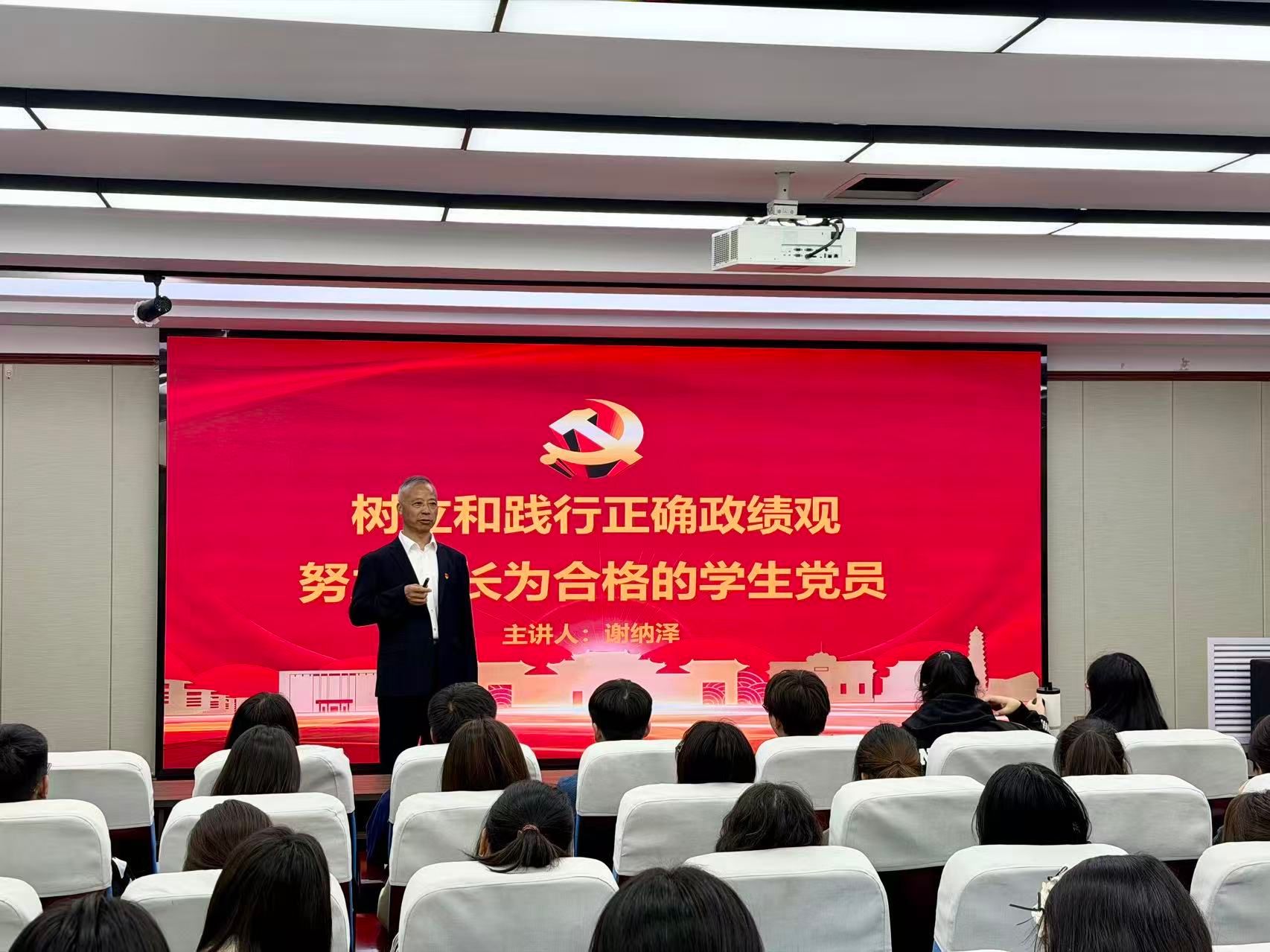 为强化思想引领,推动作用发挥,4月15日下午,我院党委书记谢纳泽在学院二楼报告厅给学生讲授树立和践行正确政绩观专题党课。我院研究生党员代表、第二十三期入党积极分子培训班学员、2026年“青年马克思主义者培养工程”培训班学员参加学习。党课由院党办主任李文芳主持。